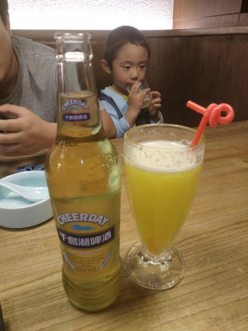 千岛湖啤酒7度的,口味不错,还有一杯果汁,超级甜,得兑水喝