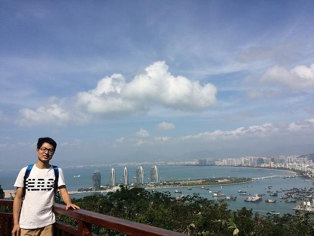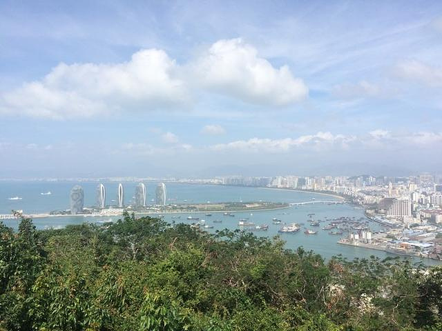 公园三面环海,一面毗邻三亚市区,是登高望海和观看日出日落的制高点,也是俯瞰三亚市全景的佳处。这次没踩点日出日落,真是可惜了。但是凤凰岛和整个三亚湾一览无遗,阳光下凤凰岛如同一艘巨舰,大楼便是招摇的风帆,非常壮观: