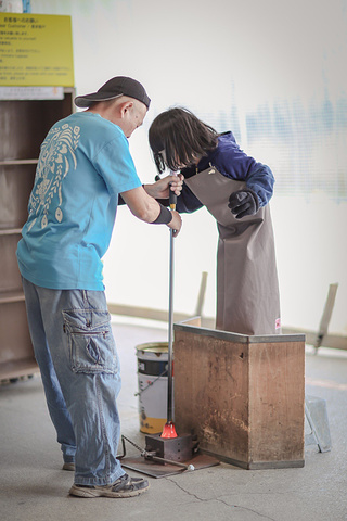终于排到溜子啦~~~站到台子上,等爷爷把连着长管烧红的玻璃放到模具里~
