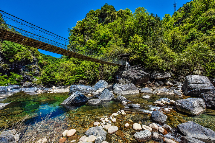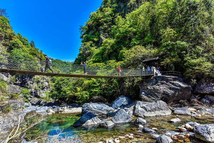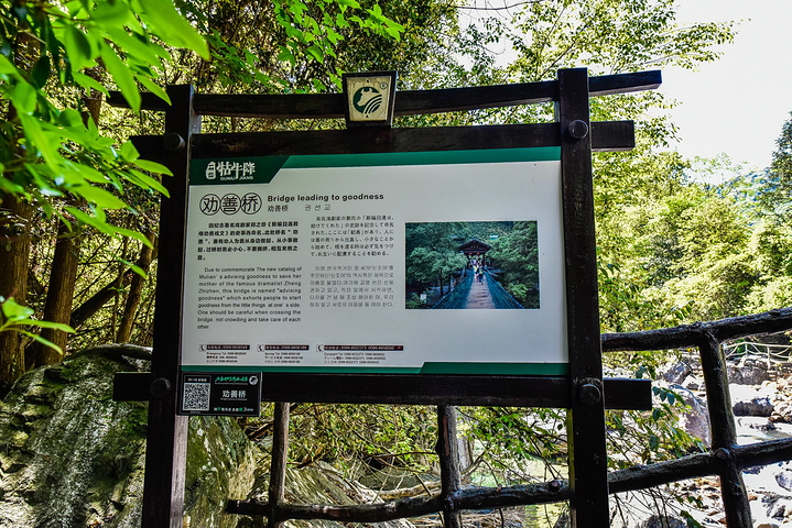 劝善桥是以佛教目连尊者为救度自己在地狱受苦受难的母亲刘氏向佛祖寻求救度方法的故事。由于目连尊者的母亲生前非常恶霸,并且吝啬小气因此而堕入饿鬼道。目连尊者通过神通知道自己的母亲在地狱受苦受难,饥饿而无法吃到食物,于是用神通给自己的母亲送去食物,没想到每次送去食物都会被其他饿鬼夺走。目连尊者就向佛祖求度了,佛祖说这是业障显现,但是看在目连大孝的心肠就赠送给一个盆子,就是佛教经常说到的“盂兰盆”,通过这盂兰盆就可以让自己的亲人吃到食物并减少地狱的痛苦。于是,渐渐地在民间就有形成了救度一切亲人的节日与法会,这个法会就是盂兰盆节了,盂兰盆节定在每年的农历七月十五。根据盂兰盆经中记载,人活在世界上一定要行善,多做善事、多说善言、多行善为,这样的人在命中之时可以不受痛苦。牯牛降这里的劝善桥就是早在地藏菩萨来九华山以前就在这里专门讲经说法劝一切众生以善良为本,而作为地藏王菩萨道场的九华山到牯牛降仅仅百里的路程,所以说这样的故事的真实性就更加有说服力了。这座横跨牯牛降河的小木桥就这样命名为劝善桥了。以前的木桥因在时间太久远而毁坏掉,现在的这座吊桥就是在以前的劝善桥遗址上建设而来的。现在的劝善桥已经成为一座可以晃动的、带有玩乐性质的观光吊桥了。劝善桥虽然不是一个非常重大的景点,但是很有故事,更有教育意义。所以,山野君认为这样的吊桥可以多多打听它们的前世今生,或许这样的牯牛降之旅收获会更多。