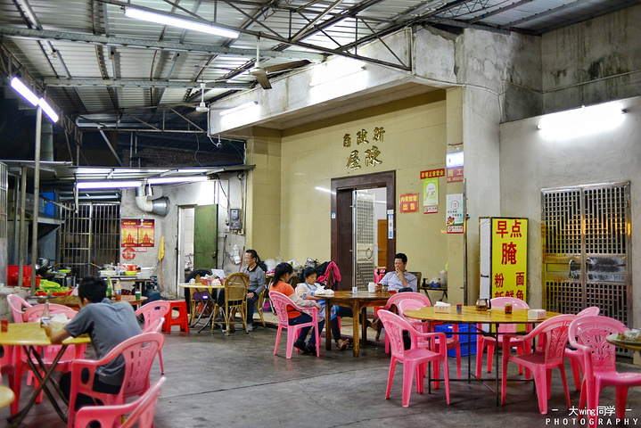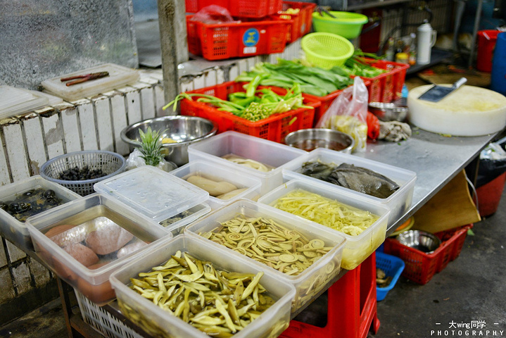 在本地人的推荐下,我们来到位于金沙湾附近斜坡旁的新陂角陈屋吃夜宵,这里主打“新鲜鱼煮粉”,另外还有各种小炒,做早、午、晚、夜宵四餐,深受老街坊的欢迎。