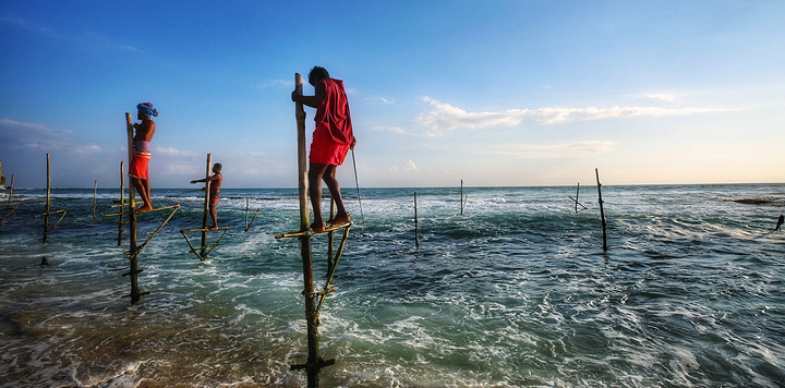 【高跷渔夫】在斯里兰卡的南海岸线,我们还有一个任务,那就是拍拍那兰卡独有的高跷渔夫。 在斯里兰卡,清晨和黄昏涨潮的时候,渔夫会爬上固定在礁石中的木杆上钓鱼,样子就像在踩高跷,因此被称为高跷渔夫,2009年LP的封面正是高跷渔夫的相片,高跷渔夫成了斯里兰卡的标志性画面,让我觉得非看看这个技术高超的渔夫不可。