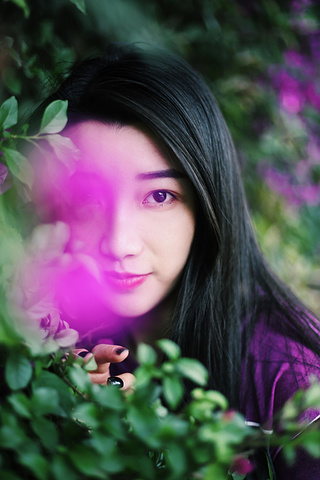 应该调整为:人站在花的空隙处,「与花有互动」,或嗅或观望或弄头发或帽子遮挡低头开心大笑。并注意镜头方向,摄影师应该站在花丛的正对面去拍,这样的背景就不是马路。如果背景杂乱就拍竖图