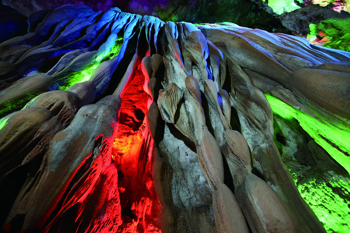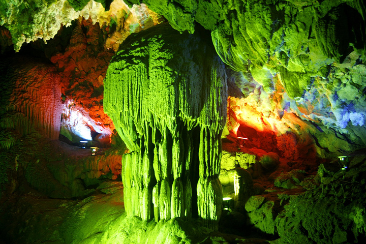 听说溶洞凉爽,我们俩旅行的第一站就选在溶洞。勐远的溶洞群是北纬21°唯一的热带雨林溶洞群,洞内一年四季都保持21℃的恒温。走下溶洞,映入眼帘的是形态和色彩各异的岩石。灯光将岩石照射出绚丽的色彩,水滴沿着石笋的纹路落下,发出清脆的“啪嗒”声。沿着暗河走,能看见各种形状的岩石。最先看到的是“九天瀑布”:一块巨大的石壁上刻着波浪形的线条,线条从洞顶直冲向地面,仿佛流动的瀑布。这瀑布一眼看不到顶,可谓“飞流直下三千尺”。一直往前走,还能看见形如骏马、飞鸟、大象、孔雀的岩溶造型。它们错落有致地分布在溶洞中,就像是上天将地上的景物复刻到地下,令人应接不暇,不住发出“鬼斧神工”的感叹。