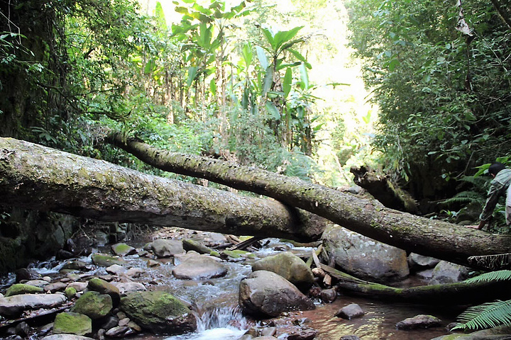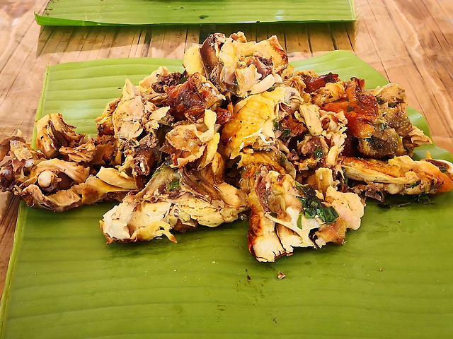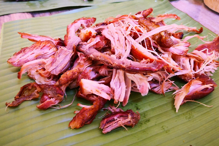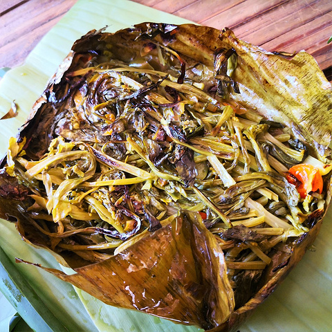 出了宝角牛洞,我们俩已饥肠辘辘,便在出口附近选了一家“情人桥餐厅”。据说这里是当地年轻男女劳作后相聚的地方,常常见证“人约黄昏后”的情景。“情人桥”也因此得名。然而,我在这里只能和基友共进晚餐了。不管怎样,先来一杯清凉的鲜榨果汁吧!再点两份竹筒饭、一份酸笋煮鱼和香茅烤鸡。鱼肉鲜嫩不带腥味,酸笋爽口。烤鸡香辣可口,有一种东南亚菜的味道。吃完饭,我们就回到旅店养精蓄锐,为第二天的雨林穿越做准备。