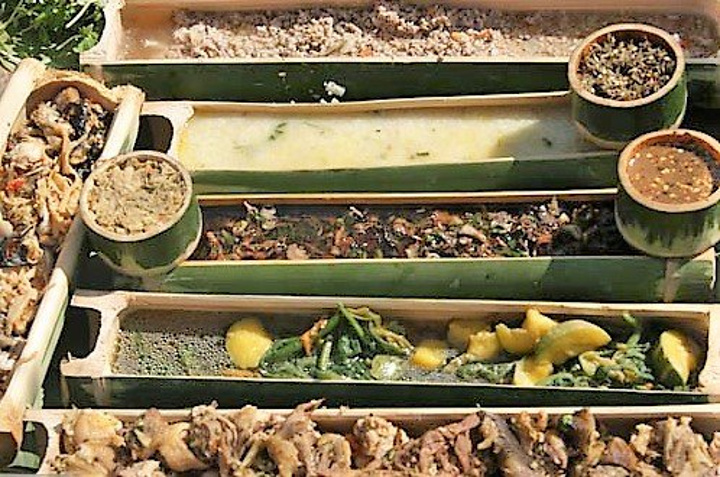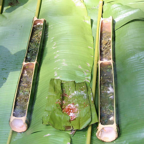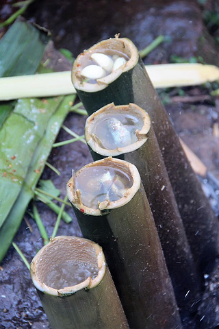 煮熟的食物可以盛在竹筒内,也可以盛在芭蕉叶上