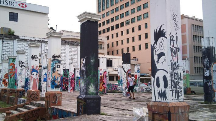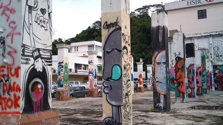 从Haji Saman路继续往前走一点儿,绕过一个小的环岛,我们便基本上走到了市区的东北端。现在回头,经过一片很有特色的水泥柱涂鸦区,我们将沿着著名的Gaya街走回去。