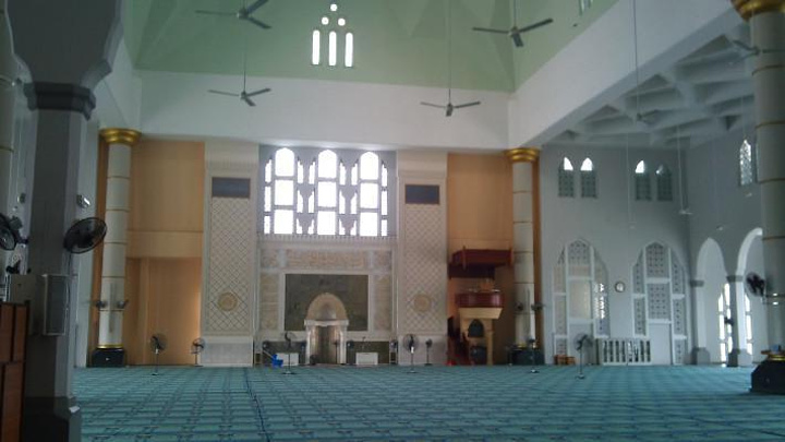 清真寺位于亚庇市中心东北里卡士湾(Likas Bay)边的一个人工湖上,从很多角度看,这座清真寺都感觉如同浮在水面之上,因而得到“水上清真寺”的美称。寺庙的主体建筑于1997年建成,占地一公顷,可容纳最多12,000名教徒祈祷。清真寺通体洁白,唯有大殿的穹顶和四座宣礼塔的塔顶是天空的蓝色,当晴天万里碧空的时候,白色的清真寺连接着蓝色的湖面和蓝色的天空,在水面形成对称的倒影,是这里最美的景色。