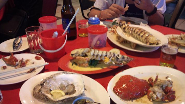 沙巴的其他消费其实并不便宜,比起泰国绝对算贵的,但唯独海鲜那是相当经济实惠啊。奶汁龙虾、黑胡椒炒螃蟹、咖喱老虎虾、白灼皮皮虾、生的生蚝和蚵仔煎,再配上一些娘惹美食