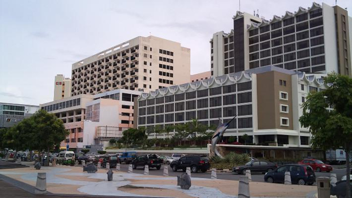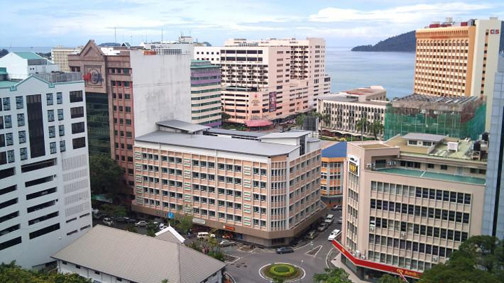 从哥打京那巴鲁城市快捷酒店出来,向北穿过酒店背后的亚洲城(Asia City)来到主干道Lebuh Raya Pantai Baru,对面就是亚庇标志性的商业中心Centre Point。