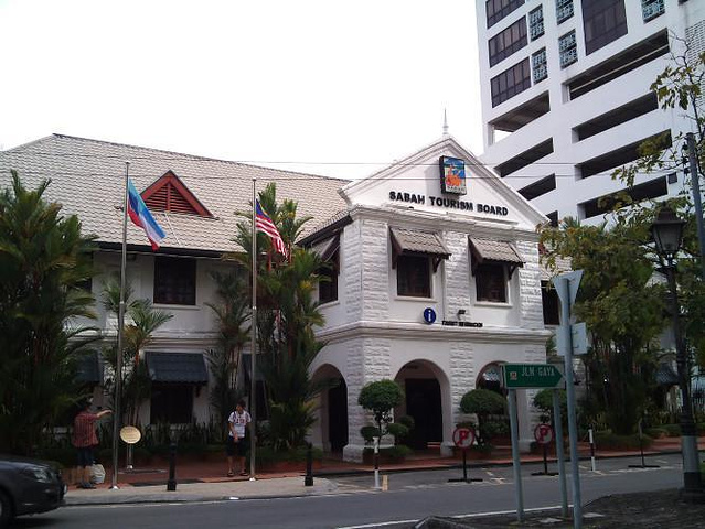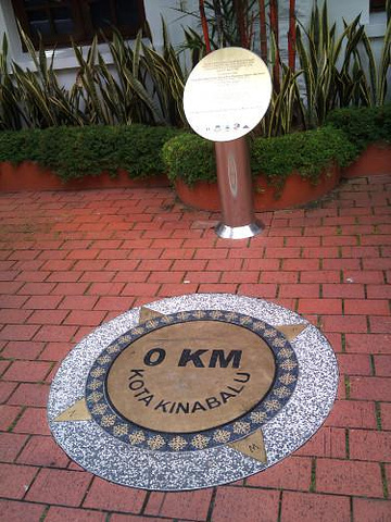 首先看的是位于Gaya街左边的沙巴旅游局咨询中心(Sabah Tourism Board),是一栋白色的两层楼房子,在这里有一个亚庇公路0公里的标志牌,就像上海人民广场有个上海公路0公里标志一样。