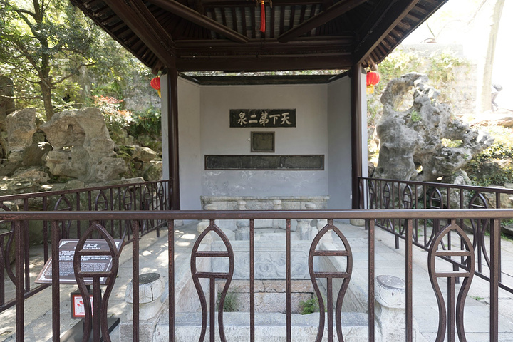 锡惠公园的古迹景点非常集中,出寺便是天下第二泉,据传唐代茶圣陆羽曾到无锡访友,居惠山寺,饮过惠山泉后,对清冽甘美的泉水很是倾心,后来品评天下水为二十等,惠山泉位列第二,天下第二泉之称得之。元代翰林学士、大书法家赵孟頫专为惠山泉书写了“天下第二泉”五个大字,至今仍完好地保存在泉亭后壁上。