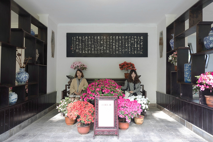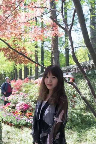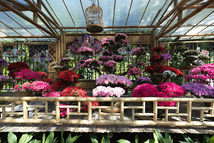 买了联票,恰逢杜鹃花节,一入门便是长长的杜鹃花街。此时杜鹃开的正热烈,两排竹制花架,其内用风筝、鸟笼等做装饰。随着热闹的人潮走着,产生了过年庙会的错觉。
