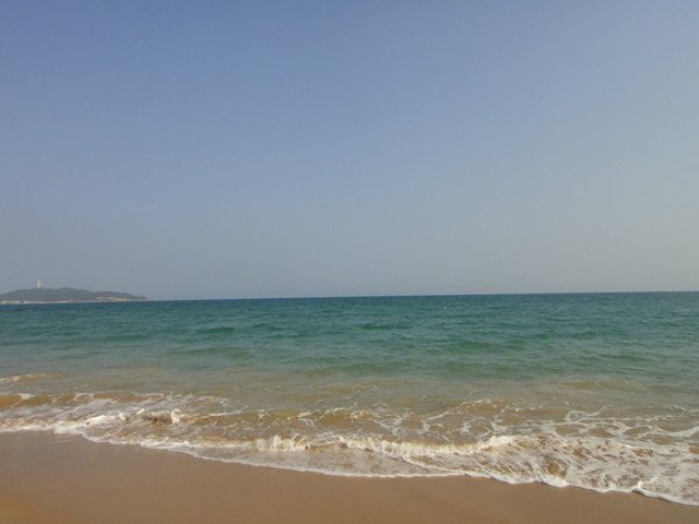 大东海的海边,海的颜色很漂亮。远处有人在游泳。相比大东海,亚龙湾的水质明显好很多。海边有供游客冲凉换衣的地方,有偿使用。