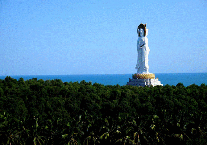 南海观音高108米,观音是一体化三尊造型,宝相庄严,脚踏一百零八瓣莲花宝座,金刚台内是面积达15000平方米的圆通宝殿。普济桥长达280米,都是佛家里的如意数字,相连的是观音广场,将佛教文化表现的清新自然。