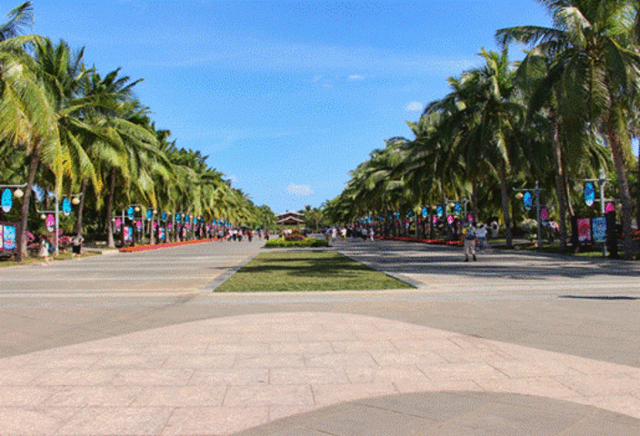 是椰子树的通道,便来到天涯海角星广场,在广场的左右,分别矗立两块石刻,分别是左侧的“爱”字和右侧杨威杨云的爱情宣言“情定天涯海角,相爱白头到老”。这些吉祥的石刻围绕着广场中央的天涯海角星与海面上的心形 “爱情石”遥相呼应,是“日月星辰,交相辉映,情定天涯,白头到老”之意,也是“海上生明月,天涯共此时”之意。