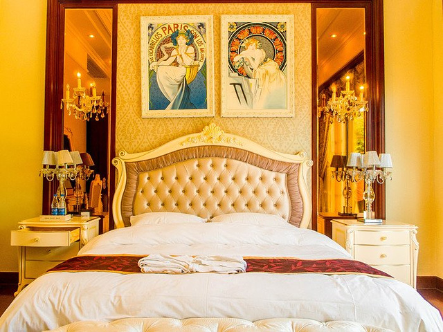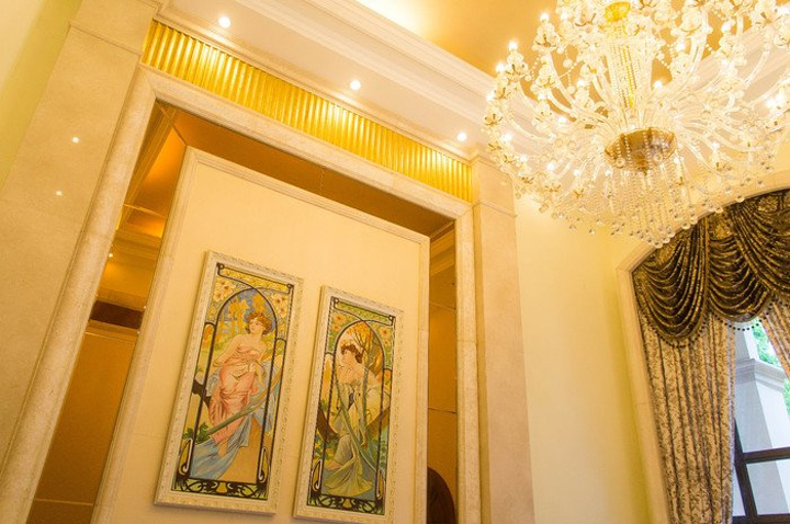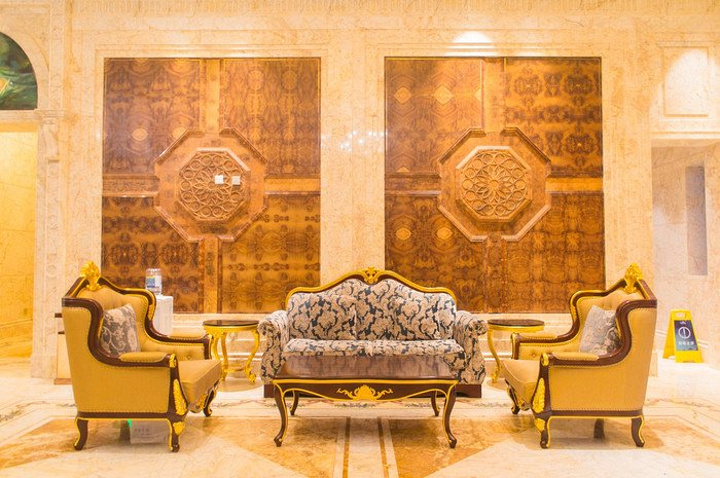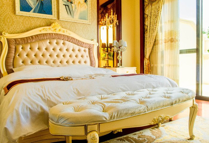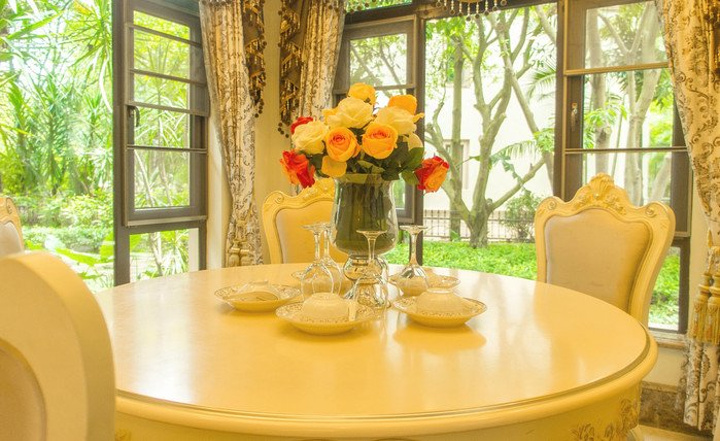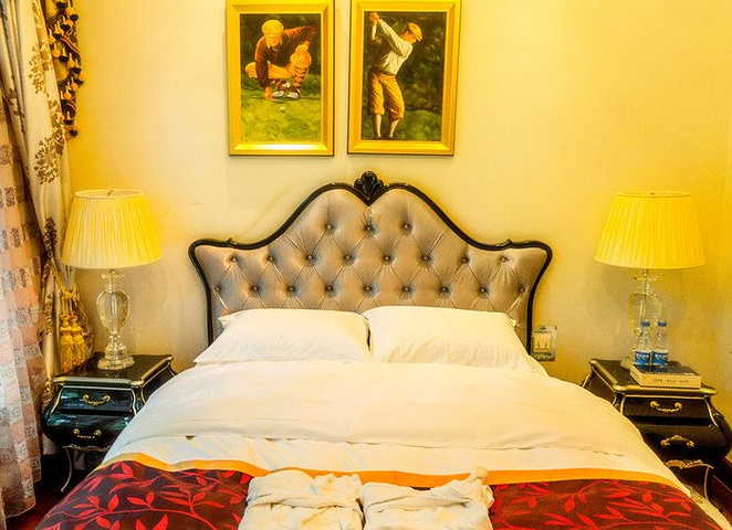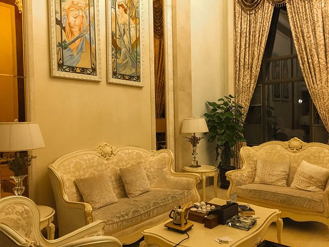 在工作人员的带领下,终于来到了本次住宿的场所,被命名为洛神宫的豪华别墅,沿着蜿蜒的路径前行,推开豪华的红木大门,映入眼前的是豪华的欧式家具,以黄色和白色为主色调,豪华而不失优雅,每一层楼都配有卫生间,一楼到三楼均为卧室,部分房间配套超大观景阳台,三楼是主人房配套独立书房,静谧而不失舒适,负一层是健身室和娱乐室,满足度假娱乐休闲要求,穿过一楼的餐厅和厨房,户外还有入户的温泉,能在夜幕降临之际,畅享肆意流淌的泉水。