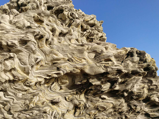 百闻不如一见,终于和闺蜜来到这里的时候,真的是被惊呆了。蓝色的大海蓝天背景下,一座座形状奇异的岩石坐立,石头上有很多水彩流淌过一般的纹路。这是海蚀石,是只有砣矶独有的。映着阳光带有一丝丝迷人的魔性。非常能吸引人的好奇心。