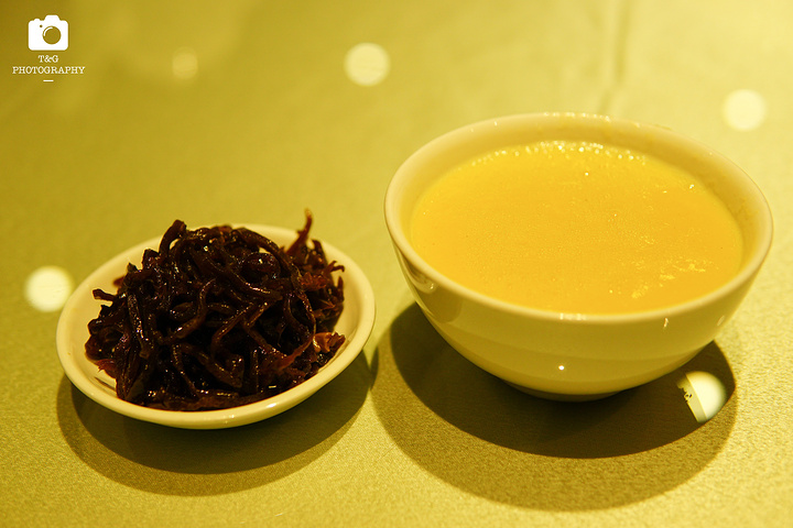 等菜的时候,每桌都会上一小碗玉米糊和小菜开胃