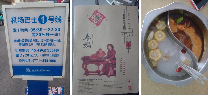 目前南宁火车站和中华路都在修建高架桥,从火车站去中华街上的酒店很不方便,就算打车也不是很方便,要绕路才行,而民航饭店距离火车站不是太远,怕第二天早上打不到车,走路也要绕路且天黑(南宁早上AM6:20才亮天),所以重新找酒店,由于在民航饭店附近三个人的房间不好找且价格高,后来选择了优家公寓酒店,环境很好,价格也不错189,三人间(一个大床+一个小床),步行到机场大巴停靠站5分钟。酒店有冰箱和洗衣机,环境整体来说不错。就是晚上睡觉能听见水管的声音,再就是能听见外面持续的轰轰声音,估计是空调吧,总的来说就是隔音效果差。起得比较晚,10点钟起来去朝阳广场重庆秦妈火锅吃了一顿火锅,味道不错,饱餐一顿,有许多知名人物来过这里,从九点徒步过来不到1Km。午餐过后在朝阳广场附近有B10路旅游快线,终点站就是青秀山公园,号称是5A景区,大约30分钟到了景区北门。但是真的很热,门票是20元/人,作为5A景区也是够便宜的了。里面电瓶车没站是10元/人,通票是34元/人,天气实在太热,南宁的天气不仅湿热,更严重的是炙烤,景区很大,有要中暑的样子啊,估计已经中暑了,走了一会儿回到门口果断买通票。有几个景点下去看了一下,啥都没有,很是失望,我不懂5A评的标准是什么。于是就直接坐到出口回优家公寓酒店了。