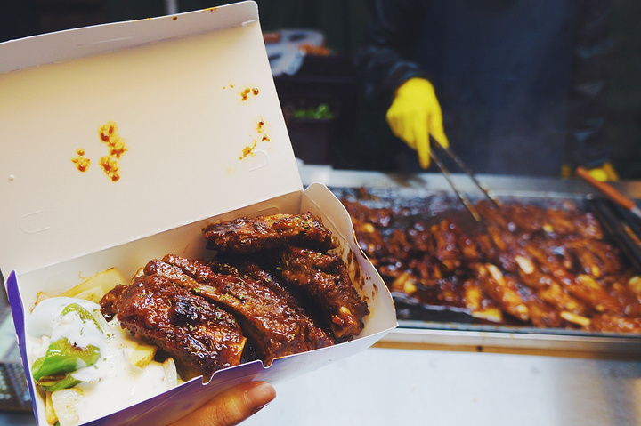 我们当然要试试辣排骨, 大邱 的辣排骨有一定名气,但我们没有太多时间啦~吃着吃着就下大雨了,超级暴雨那种,旁边正好有临时搭建的供人们吃东西的塑料棚,于是我们边吃着辣排骨边等雨停。这个排骨真的超辣,是火鸡面那种辣不是川辣不是湘辣!
