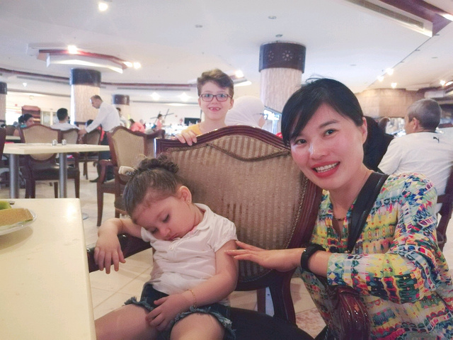 到餐厅吃饭的时候,S发现有一个小女孩在椅子上睡着了,瞬间被萌到,要求我赶紧拍张合影,突然孩子奶奶说什么吓了我们一跳,以为是因为没有经过家长同意就拍照,结果孩子爸用英文说奶奶想和我们一起合个影😝,还大大方方让我们和他的小孩合影。后边的小男孩经邀请拍照,爽快入镜,还附赠一枚小的😂,三小只可爱到让人心都融化了。(话说感觉埃及小孩小时候都是白白嫩嫩,萌萌哒,可能气候原因,长大了就没有那么出彩了)