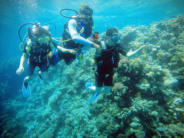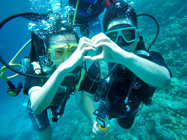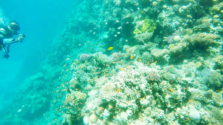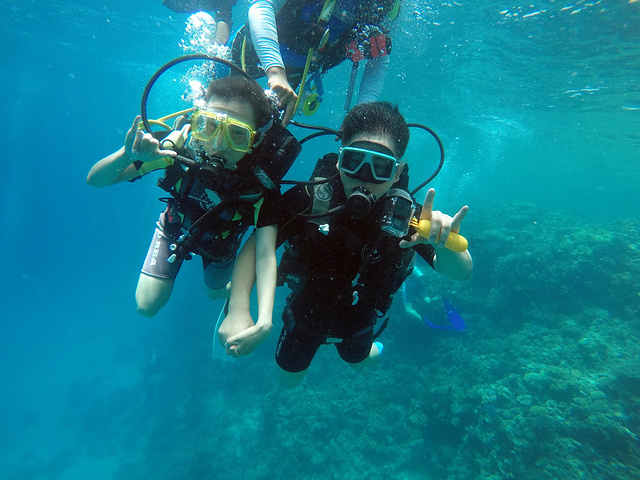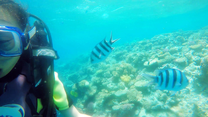 活动的第一次深潜会给拍照片刻成盘(30-40张),我自带的狗5拍摄的都是录像。简单的深潜还是很简单的,只要会用嘴呼吸就行。水下的景色还是很美的,教练会带你在珊瑚周围游,会看见很多小鱼,不要离珊瑚礁太近,会割伤人的。