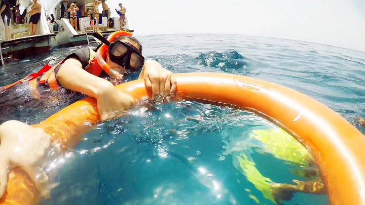 刚下水浮潜,老婆紧张的僵硬了,哈哈哈