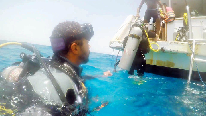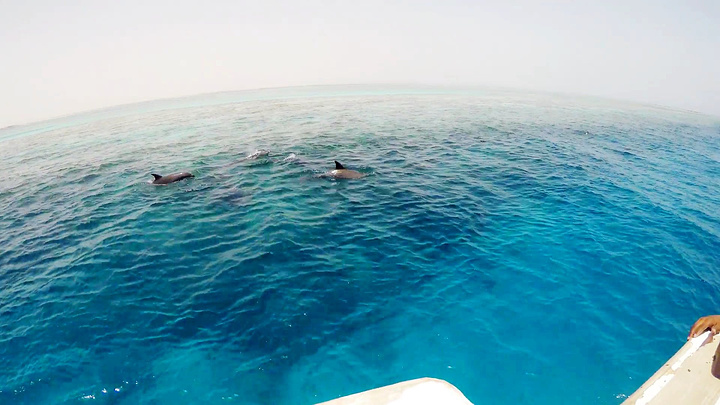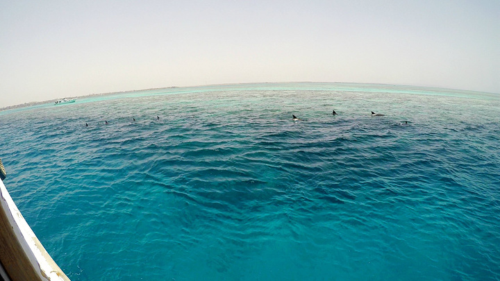 一般潜水是20分钟左右,第一次潜水完毕后,会前往第二个潜水点,在前往第二个点的时候发现了野生的海豚群,今年的运气都会好。第二个潜水点还是很不错的,带我们浮潜的是我们的导游,还是很厉害的,第二次导游带了许多喂鱼的鱼饵,在珊瑚礁周围一撒,会有上百条鱼过来吃食,鱼的种类还是很多的五颜六色的,用手都可以直接摸到他们,但是大鱼是不会理我们的。但是没看见海龟。第二个潜水点就没有水下拍摄了。