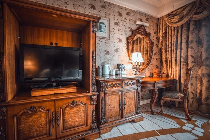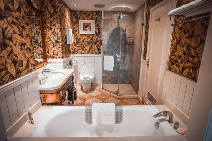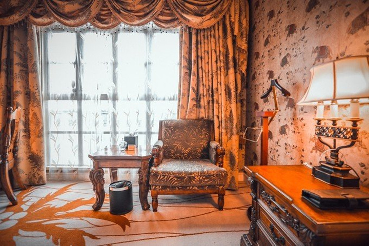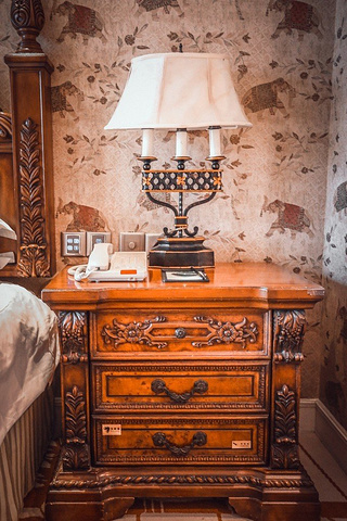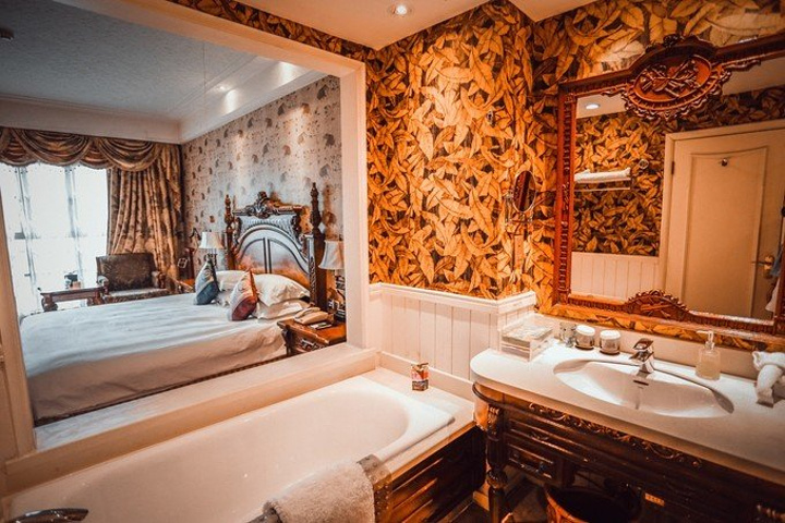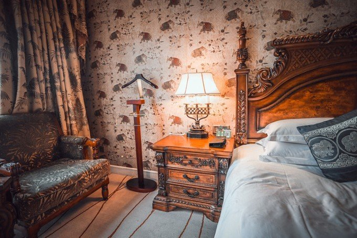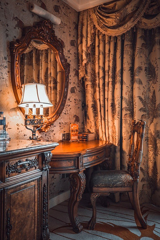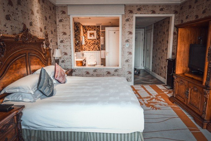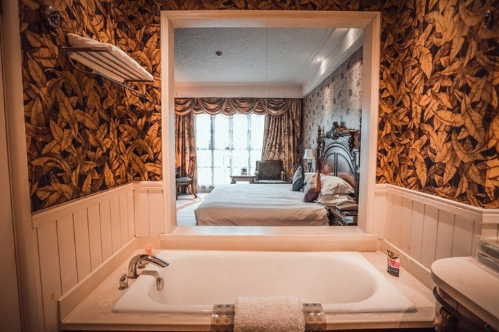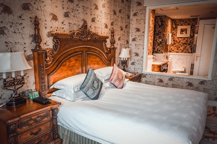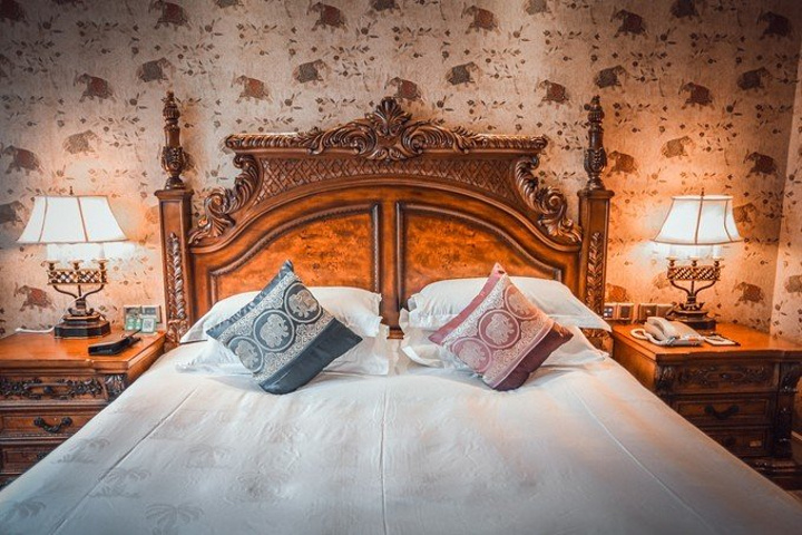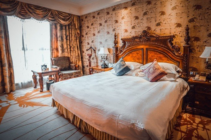 一进房间就被温馨的暖黄色调所吸引,舒适的古典实木大床和印花床品、热带动植物图案造型无处不在、无不让人产生时空错觉,仿佛进入了密林中的世外宫殿。
