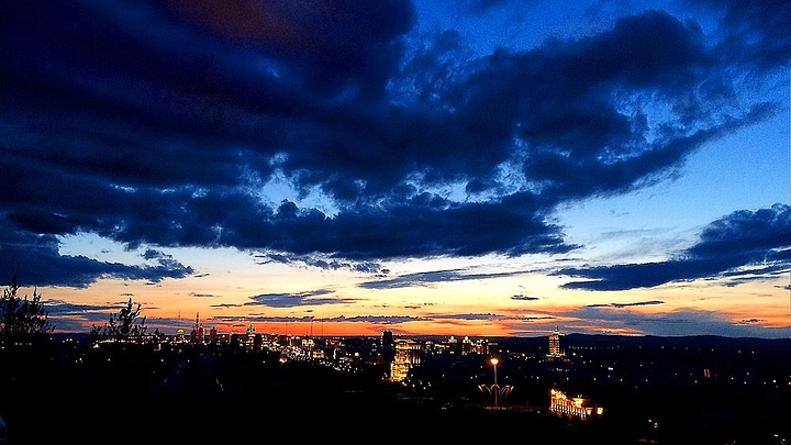 吃过晚饭后我们在商量晚上去市区里溜达溜达,打车不够机动,包车又太贵,正商量着呢,酒店年轻的老板自告奋勇为我们当司机,答应载着我们夜游满洲里,包车费只要80块钱。又帅又年轻还了解满洲里,没有比他更棒的人选了,我们欣然答应。老板先是带我们去了城郊的教堂,从那边可以看到满洲里的灯火。这里的空气实在太棒,不知道宁波什么时候也能这样,每天都能看到这么美的夕阳和云层。