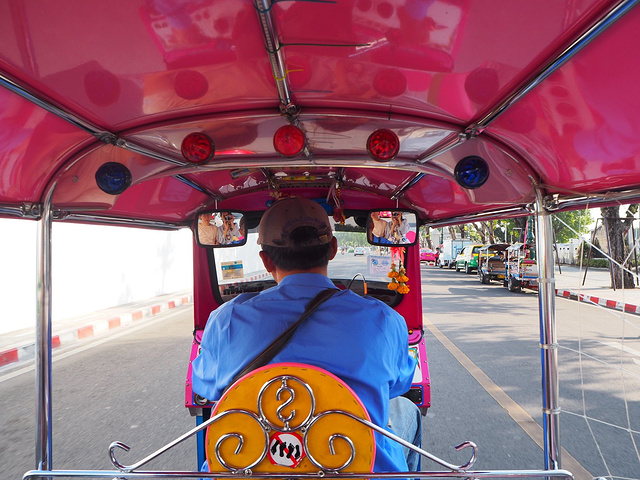 出来之后我们为了方便就直接打了辆TUTU车打算去素坤逸区吃吃喝喝了,司机200泰铢的报价也没有太高,看到粉色的小车车和空旷无人的大马路我们还蛮开心的。