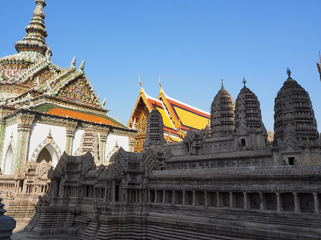 大名 鼎鼎的小 吴哥窟 位于玉佛寺附近,是 泰国 王室仿照 柬埔寨 吴哥窟 的微型建筑,按照等身比例为我们展现了一个小吴哥。据说当年真正的 吴哥窟 修复的时候就是参考了 曼谷 大皇宫这个模型。不过我们去的时候,小吴哥后面正在进行修复工作。
