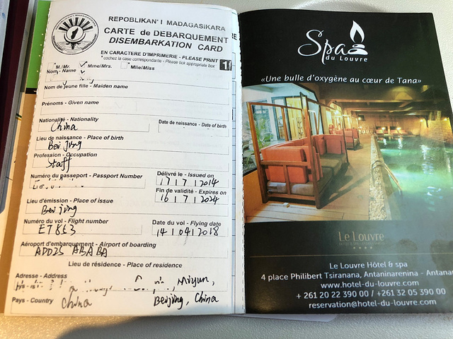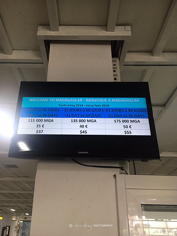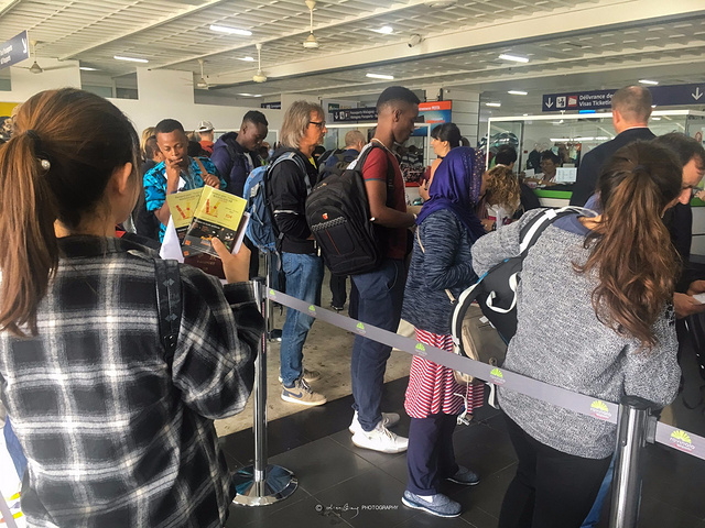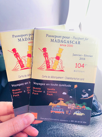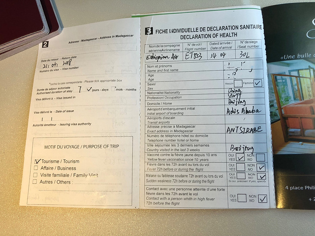 马达加斯加 的入境关口分为三部分,第一关是提交入境卡和小黄本(疫苗接种或预防措施国际证书,简称ICOVOP),这关也是我们对 马达加斯加 不好印象的开始,一位女性官员操着浓重法语口音的英语问我们要小黄本,并指着窗口张贴的的入境需出示小黄本国家列表,赫然看到手写的Chine(法语的 中国 ),我俩当场就懵逼了,这种操作也可以,临行前反复确认不需要提交,只要落地签交钱入境。一来二去,我的英文已词穷,这位官员也一脸黑人问号???最后,把我叫到窗口里,嘴里说着gift、gift,拇指和食指搓着,当时我就明白了,后续不需赘述,自己悟。gift和bonbon(法语糖果之意)是我们在 马达加斯加 的旅程中听到最多的词汇。