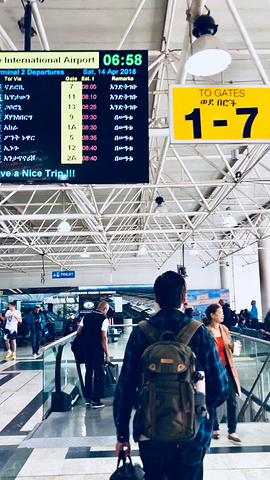 安全落地 亚的斯亚贝巴 博乐 (Bole)机场T2航站楼,面积不大,只有上下两层,一层十几个登机口,很小,但是人很多,因为 非洲 大陆很多国家的航班都是经由这里中转,还可以见到很多亚裔面孔, 中国 人也不少,多为奔赴 非洲 各国打工的海外工人或生意人。