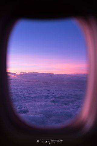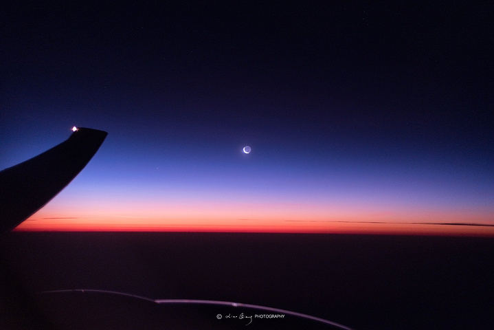 窗外曙暮光(Twilight)透过舷窗映入眼帘,一轮残月挂于天际,好像在等着太阳的出现,不紧不慢的。