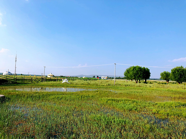 太阳快要落下了,开阔平缓的大地反射着遍野的绿色。没有高楼,没有工厂,没有商铺,没有喧器,有的只是远处的白塔,和点缀在绿色海洋中的几座乳白色的蒙古包。