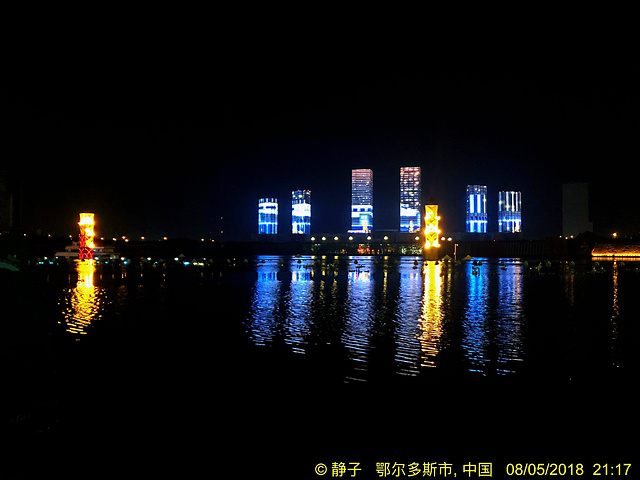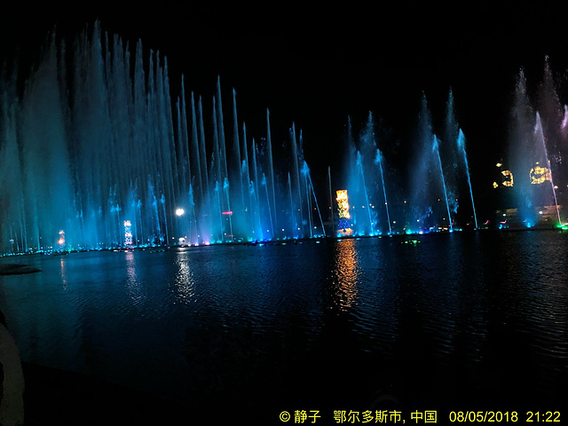 康巴什的乌兰木伦湖音乐喷泉是世界规模最大的音乐喷泉,也是最高的喷泉,可以喷到209米。现在每个周末晚上开放,时间为7:30到9:30,吃完饭已经快9点了,15分钟的车程,还没靠近广场,就遇到交通管制,来鄂尔多斯这么多天第一次看到堵车,感觉整个城市的人一下都出来了。好不容易找到一停车的地方,我们步行进入广场。