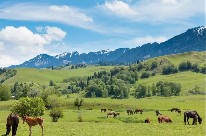 新疆有那拉提草原,山处处绿茸茸的,远看像是铺了一块很大很大的“毯子”,延伸至远方,近处的牛羊悠闲的吃草。