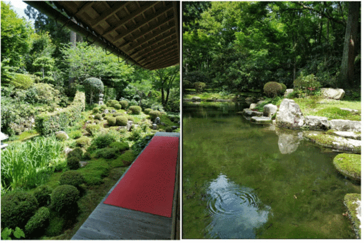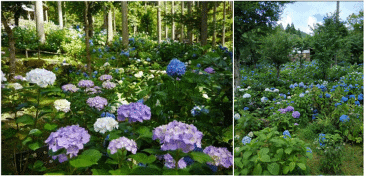 雨季节,紫阳花盛放,花簇繁茂蓬勃,清幽雅朴。其庭院不同于一般印象中日本庭院“枯山水”的风格,寺内北侧的琉璃光庭,各样植物花草,参天古杉;绮草芊芊,岚峰伍伍;安静雅致。秋有红叶,冬有皑皑雪景,坐在庭院边静静品杯清茶,四季美景不断。