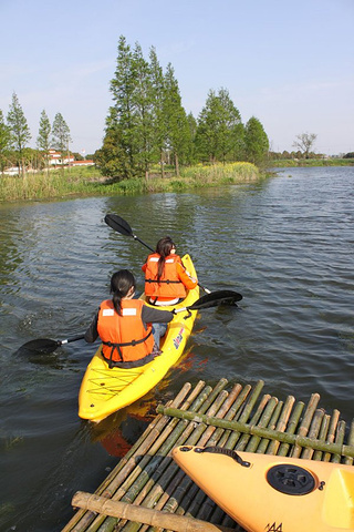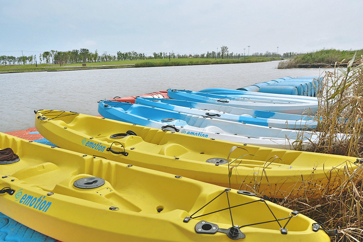 阳光照耀的水面,水面上泛起金色的波光,如能泛舟,岂不是一桩惬意的事,正想着,在浮桥的尽处,有着皮划艇的游玩设备。