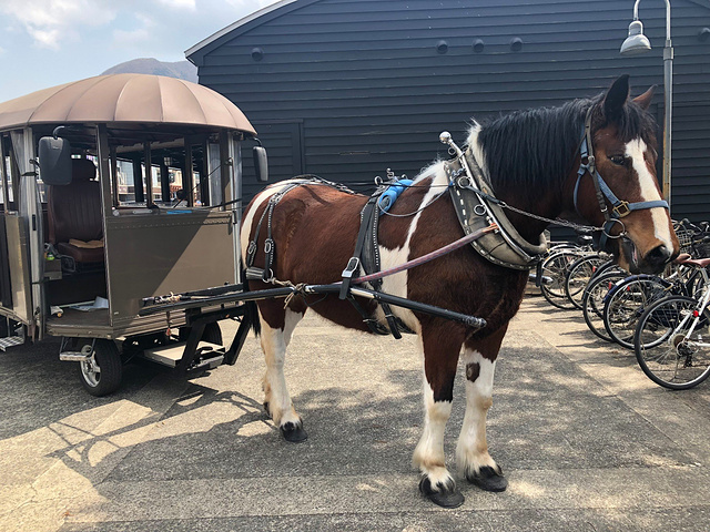 如果要购买从由布院到别府的直达票,出发时间上就会稍晚一些,中间的空闲时间可将行李寄存在车站后前往由布院镇上漫步,顺便把午餐解决~由布院站前的小马车也可以乘坐哦!我和老李因为寄存箱满了没法寄存行李,所以只好遗憾的放弃乘坐小马车啦,毕竟拿着两个大行李箱很不方便。