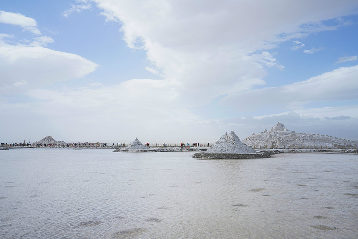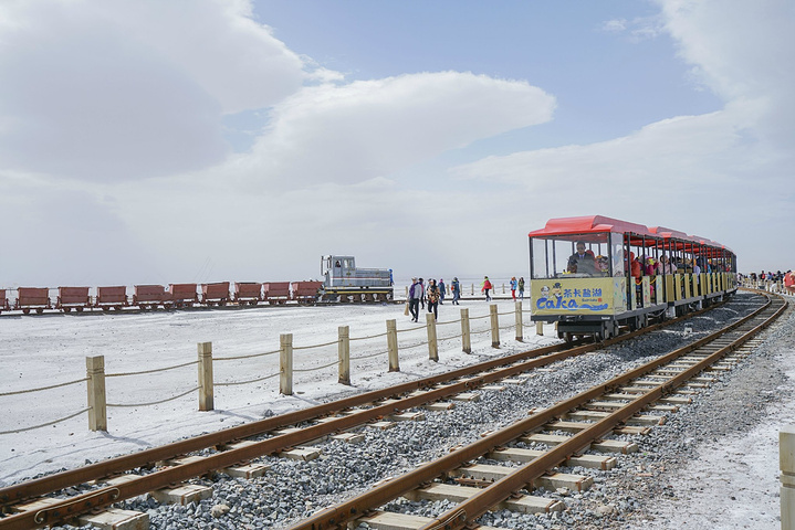 茶卡盐湖位于乌兰县茶卡镇境内,距离黑马河乡约80多公里。茶卡盐湖是一座3000多年的盐场,湖水含盐量很大,会自然结晶成为一片白色的湖面,将天空、云朵和对岸的山都倒映在湖里,被称为天空之境。景区里有很多的盐雕可以欣赏,还可以乘坐小火车,到盐湖的中心(很遗憾,我们去的时候阴天刮大风,没能拍到倒影)。