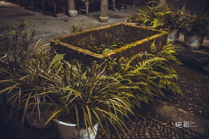 院落古朴静谧,透过屋顶看到一片四方蓝天,院子里长满青苔的石槽,鹅卵石铺砌的庭院,随处可见的吊兰绿植,雕栏画栋的屋檐和门槛,整座陈列馆散发着古朴厚重的味道。