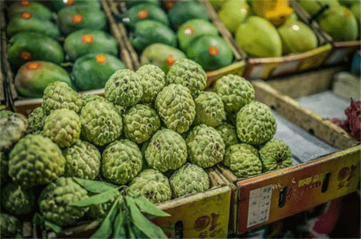 市场里面还有各种各样的热带水果,真是大开眼界了,上图的叫释迦果,是不是很像佛头?也叫佛头果,我们买了两个,价格不是很便宜,水分也不是很多,具体来说,像是榴莲那种水果,纯果肉比较多,水分不多,释迦果比较甜,也很有营养,但是释迦果的甜,不是腻人的那种甜,只是刚刚好的甜度,据说,释迦果是一种美白养颜的水果,而且促进消化,长期食用对身体是很好的食补哦接下来,大波美食来临很多人都说,