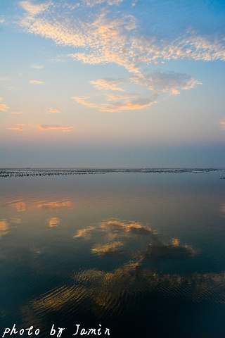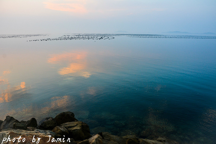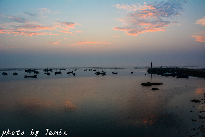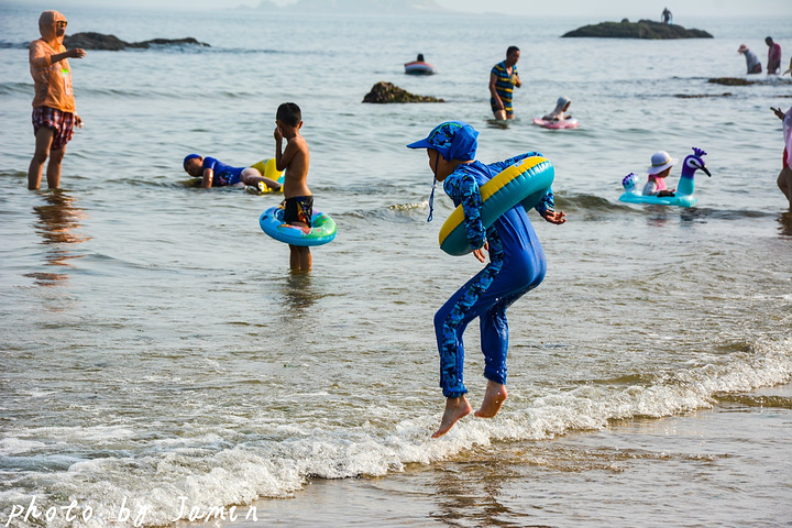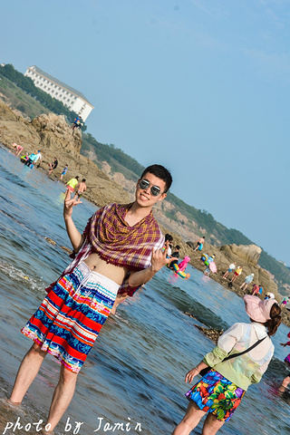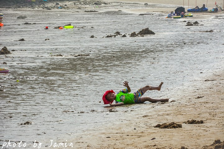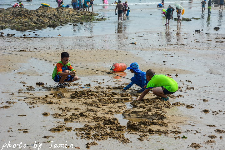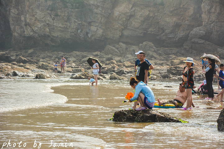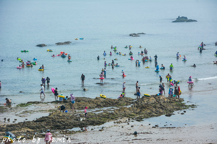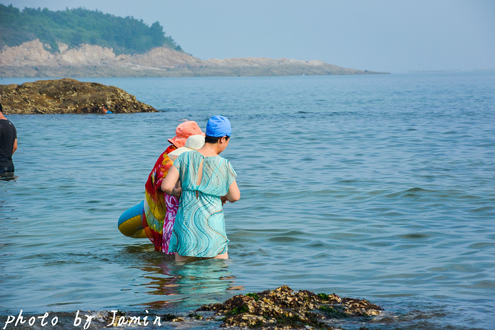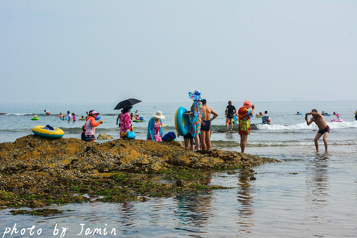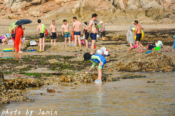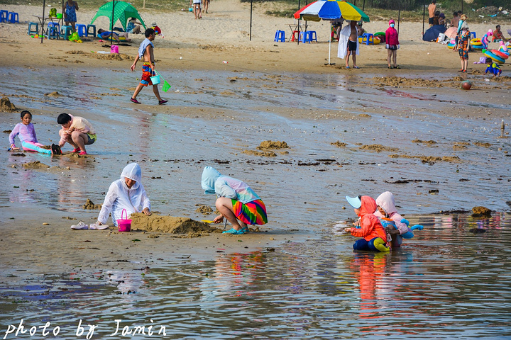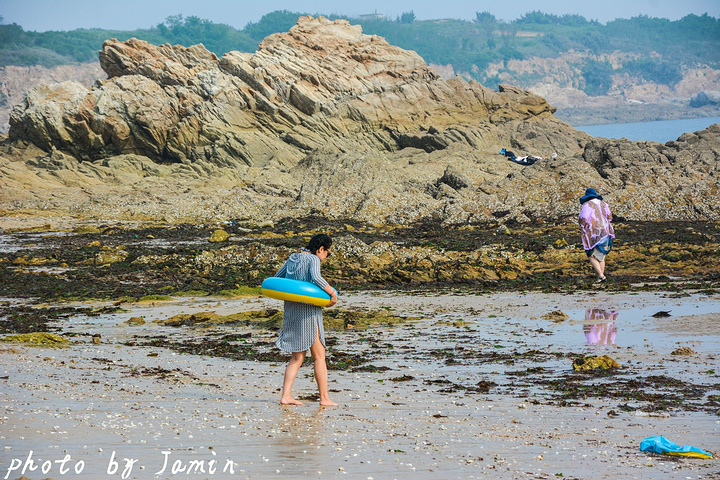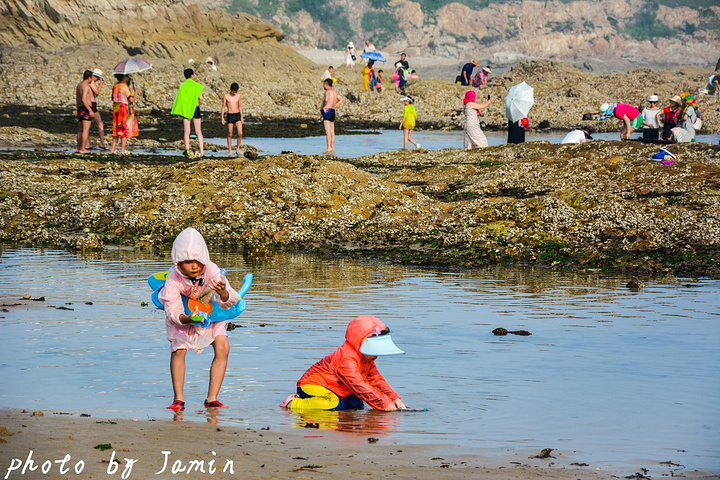这片沙滩在两山之前,还算清静之地。下午的时候正直退潮,海岸线能退出四五百米,海底的礁石也都裸露了出来,所以最好穿双水鞋,以免伤到自己,不过远处山脚下的那片礁石地倒是个挖螃蟹扇贝的好去处