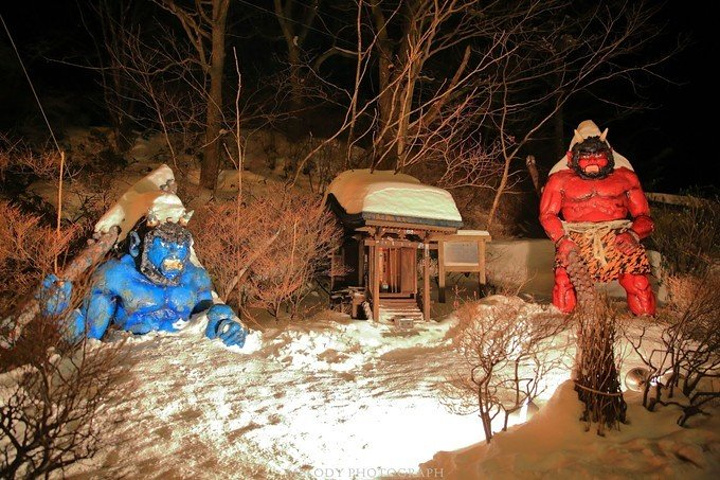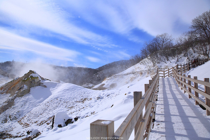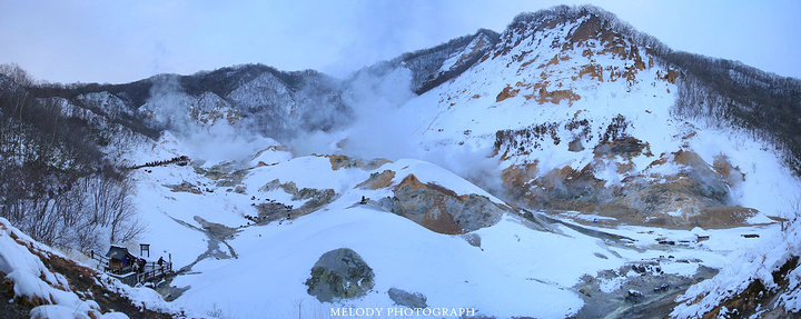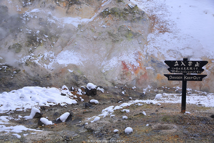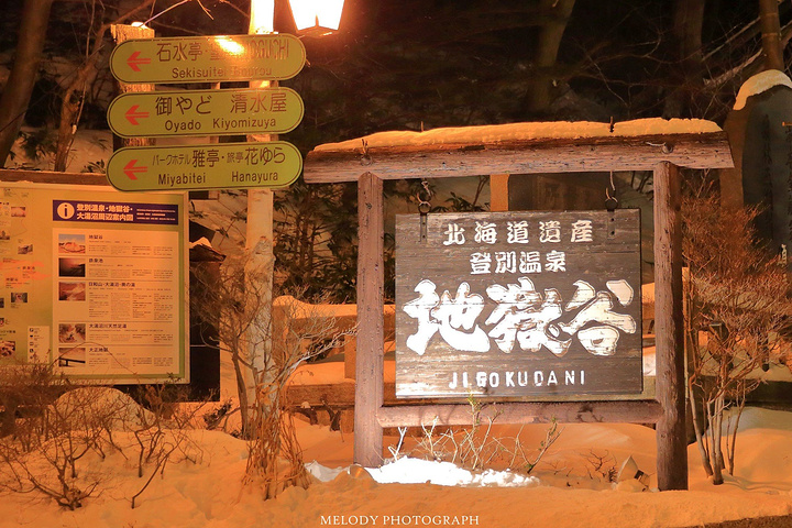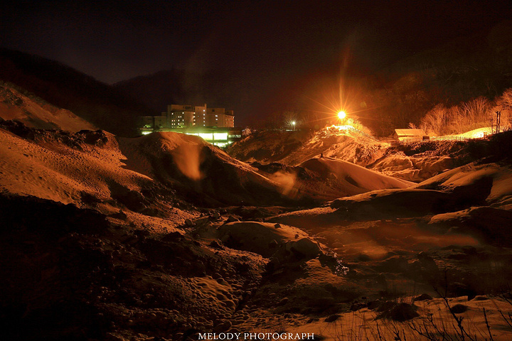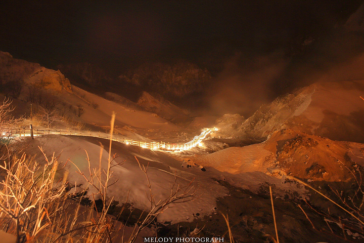 沿着木结构搭建的栈道,走向地狱谷的深处,雪地里每隔几步点着一盏暗黄的灯。望向前方,一路“鬼火”,延伸至昏暗不知深处的远方。眼前飘逸着不时喷发的火山浓烟,鼻腔里灌满硫磺浓烈的味道,耳边山风诡异地呼啸着,如同恶魔要撕破结界,着实令人毛骨悚然。