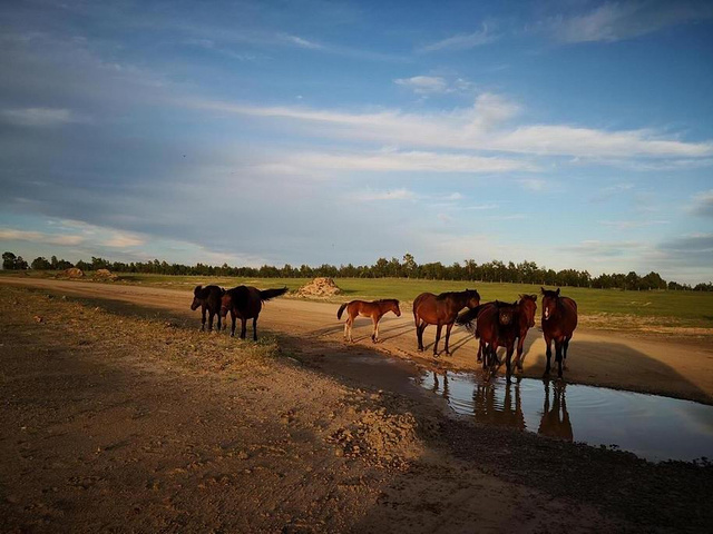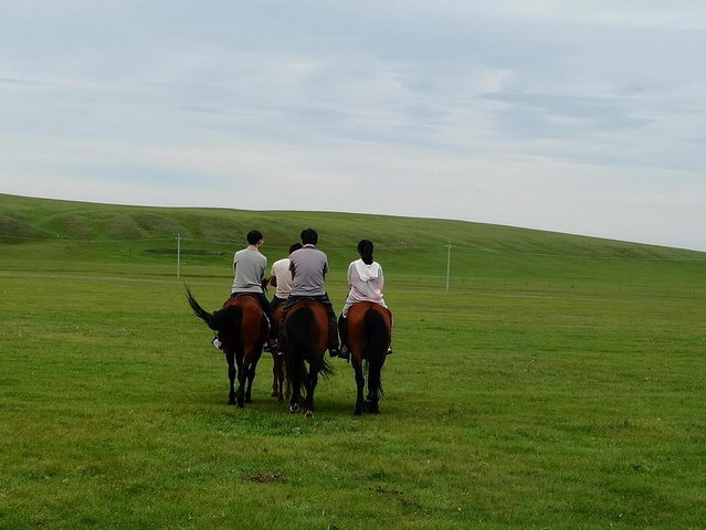 继续返回 ,17:30左右行至金帐汗蒙古部落(百度:金帐汗是呼伦贝尔以游牧部落为景观的旅游景点,位于呼伦贝尔草原“中国第一曲水”的莫尔格勒河畔。这里是中外驰名的天然牧场。中国历史上许多北方游牧民族都曾在这里游牧,繁衍生息。十二世纪末至十三世纪初,一代天骄成吉思汗曾在这里秣马厉兵,与各部落争雄,最终占据了呼伦贝尔草原。金帐汗景点的布局,就是当年成吉思汗行帐的缩影和再现。法国、日本、德国、香港、台湾、俄罗斯等中外影视剧组纷纷纷此拍摄影视剧,是理想的草原影视基地。历史传说:公元1202年,铁木真向义父王汗和义兄扎木合等蒙古贵族保守势力发起了一场讨伐战役。这场战役发生在今陈巴尔虎旗莫尔格勒河谷中会屯山一带,所以蒙古史书中也称“会屯战役”。铁木真帅部从左侧也就是从今兴安岭西麓突然袭击了敌人,当打乱了敌人阵势后,铁木真部撤回会屯山上,敌人以为铁木真阵败而后撤,便紧跟追杀过来,这时铁木真部从山上射出无数箭,象暴风雨般下来,然后象猛虎般冲杀下山来,敌人败下阵来四处逃窜。通过“会屯战役”的胜利,铁木真进一步巩固了自己可汗地位,征服了蒙古高原的东部地区,在雄伟的呼和温都尔附近,美丽富饶的莫尔格勒河谷中架起了铁木真的金帐,庆贺了这场辉煌胜利。)