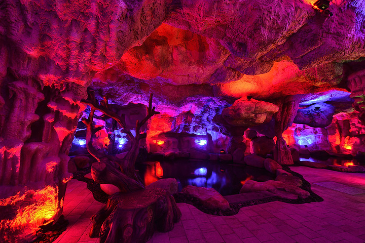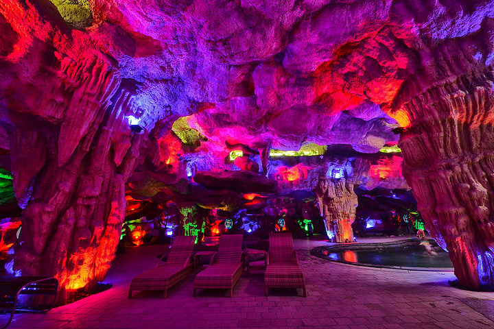 与其他的温泉不同,嘉华温泉酒店的溶洞温泉极富特色。洞外瀑布流水,荷池清香,仿若仙境。洞内冬暖夏凉,五彩斑斓,走进去,便仿佛真的走进了钟乳石洞的肚腹,走进了孙悟空的花果山水帘洞,有桌有椅,慵懒舒适。