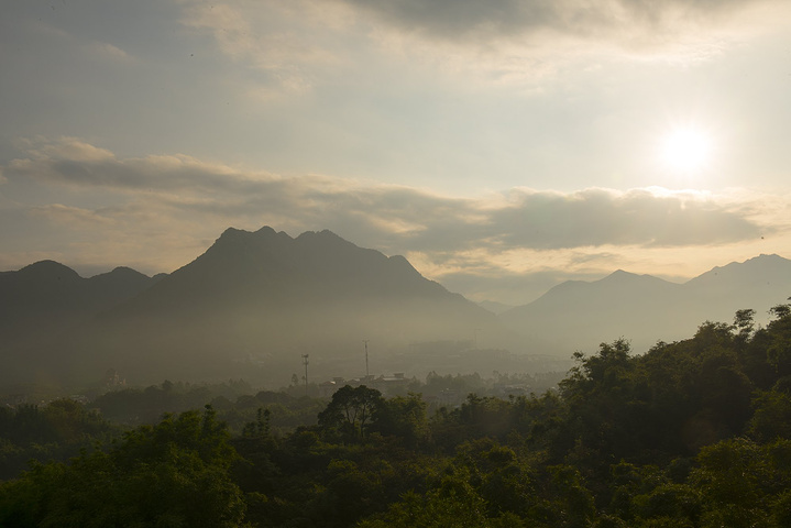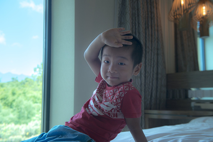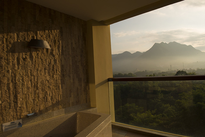 也许是房间的温度太过舒适,也许是客房的枕头过于柔软,竟然一觉睡至天大亮,错过了早上的日出。拉开窗帘,太阳早已升至山顶,照得阳台的温泉池一片暖黄。山色被笼罩了一层薄雾,淡淡如烟,恍若仙界。